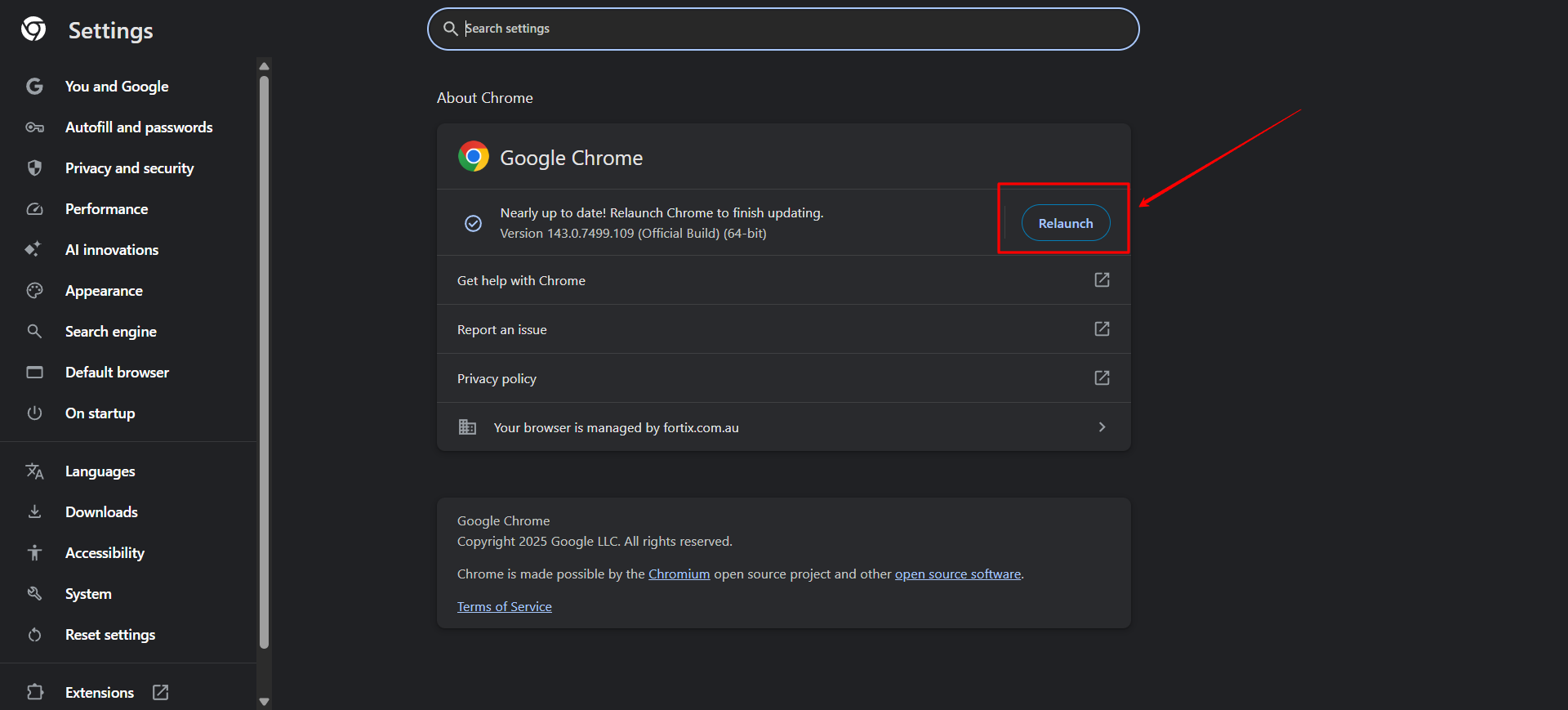 - Once the update finishes, click Relaunch to restart Chrome.