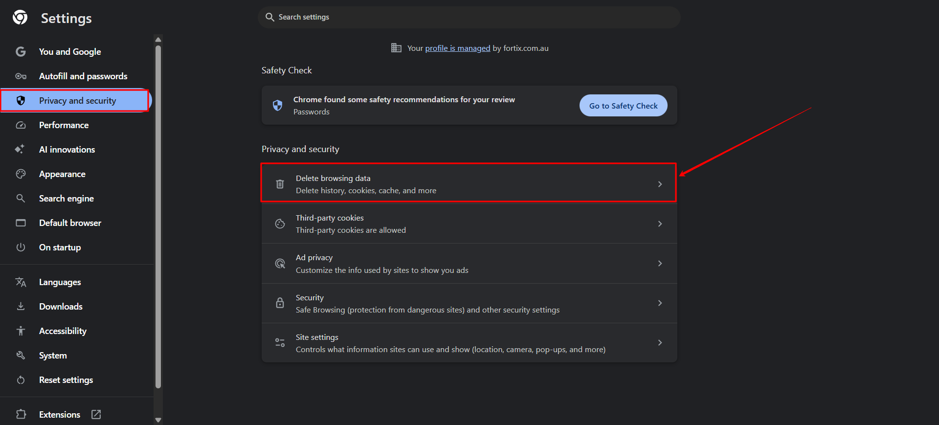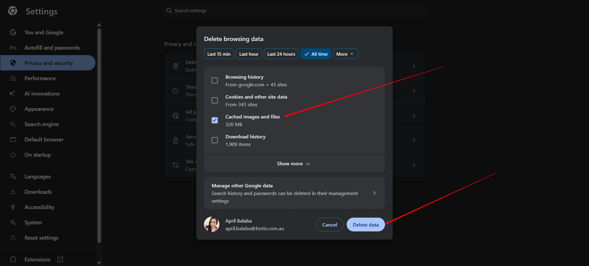 - Go to Settings → Privacy and security → Delete browsing data.